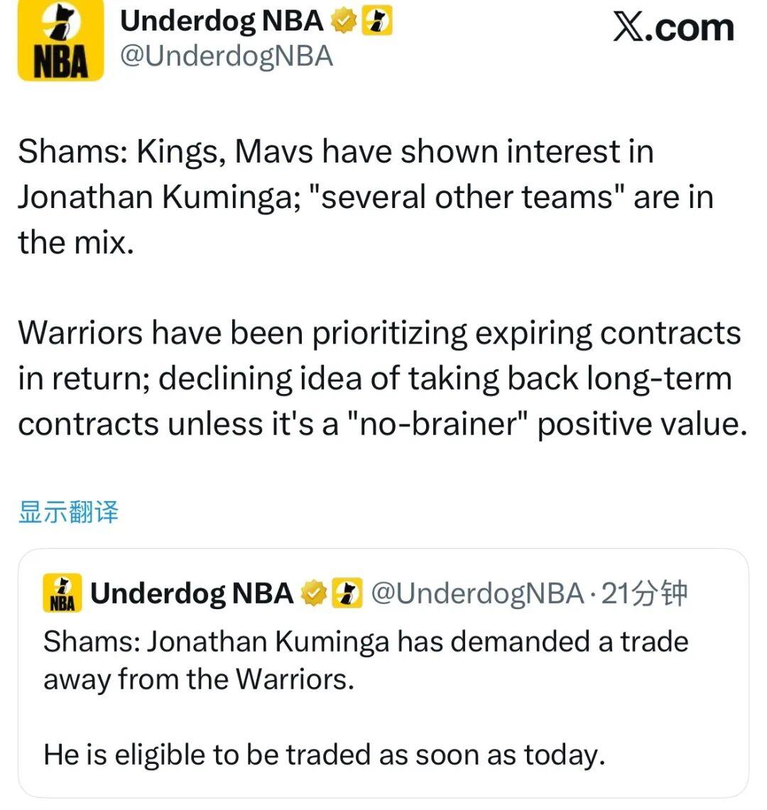 同样来自Shams的消息源,去年休赛期签约的两年4680万美元续约合同(第二年球队选项),库明加认为自己是被迫签署的,此举进一步恶化了他与勇士管理层的关系。