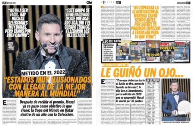 《民族报》把报道集中在国家队成绩帮助梅西赢得金球这个概念,该报认为,这个金球是梅西职业生涯一直缺少的——凭借在国家队的出色表现赢得的金球(文首配图)。