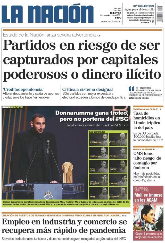 《国家报》的唐纳鲁马封面,是哥斯达黎加媒体的一个代表,他们的门将纳瓦斯在巴黎圣日耳曼和唐纳鲁马竞争,哥斯达黎加人对此很在意。目前是纳瓦斯更接近主力地位,所以《国家报》的标题是:唐纳鲁马赢得最佳门将荣誉,但他踢不上球。