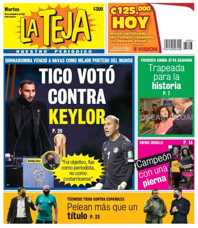La teja是哥斯达黎加的一个俚语词汇,可以用于很多场合,直接把这个报纸翻译成《瓷砖报》似乎不太合适。这家报纸直接针对哥斯达黎加的金球奖评委罗德里戈·卡尔沃,抨击他投票给唐纳鲁马没有捍卫纳瓦斯。罗德里戈·卡尔沃强悍回击:“我是作为评委投票,不是作为哥斯达黎加人。”