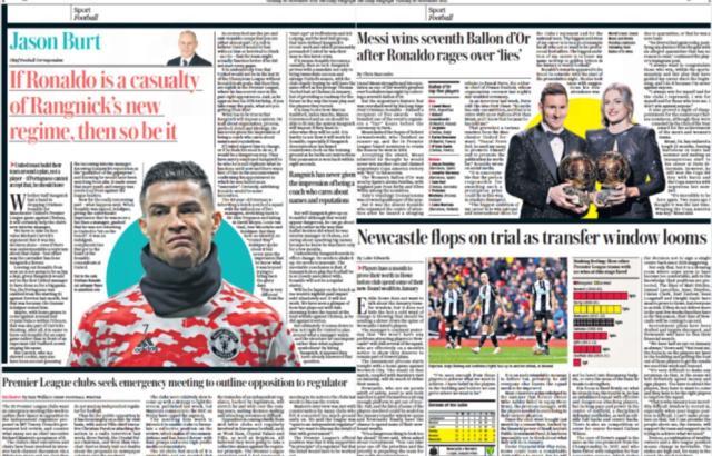 “C罗为所谓谣言暴怒之后,梅西赢得第7座金球。”《每日电讯报》使用这样的句式把梅罗2人关联起来,到底是想突出谁?在旁边的一篇专栏文章中,C罗是毫无疑问的主角,评论员伯特说,朗尼克的曼联必须围绕一个计划来建队,而不是围绕一个球员建队,如果C罗不能接受,他就得走。